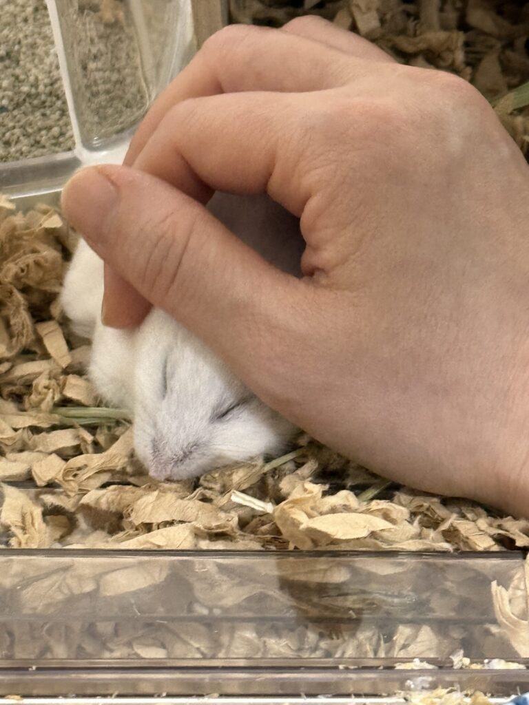 私たちのハムスターライフの原点。パールホワイトの美しい男の子でした。 彼は、妻のなでなでで、無防備に眠りに落ちるような子でした。その小さな温もりを感じた時、この子たちにも、私たちと同じように心があると、深い信頼の形を教えてもらった気がします。
